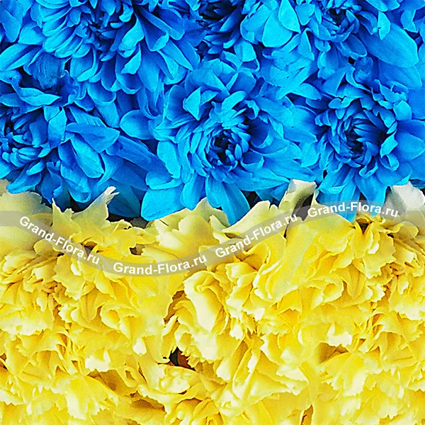 ДЕЛЮКС: гвоздика кустовая желтая (или замена на хризантему кустовую желтую) - 25 шт, хризантема кустовая синяя - 20 шт, оазис.