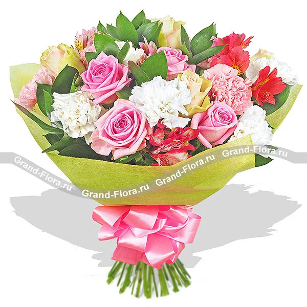 Стандартный (на фото): роза розовая - 5 шт., роза желтая - 4 шт., гвоздика розовая - 5 шт., гвоздика белая - 5 шт., альстромерия розовая - 1 шт., альстромерия красная - 2 шт.,