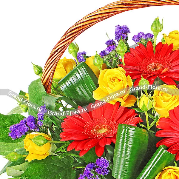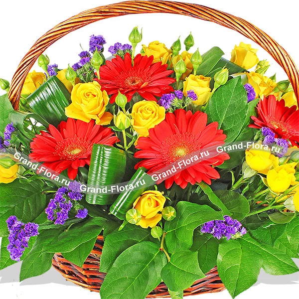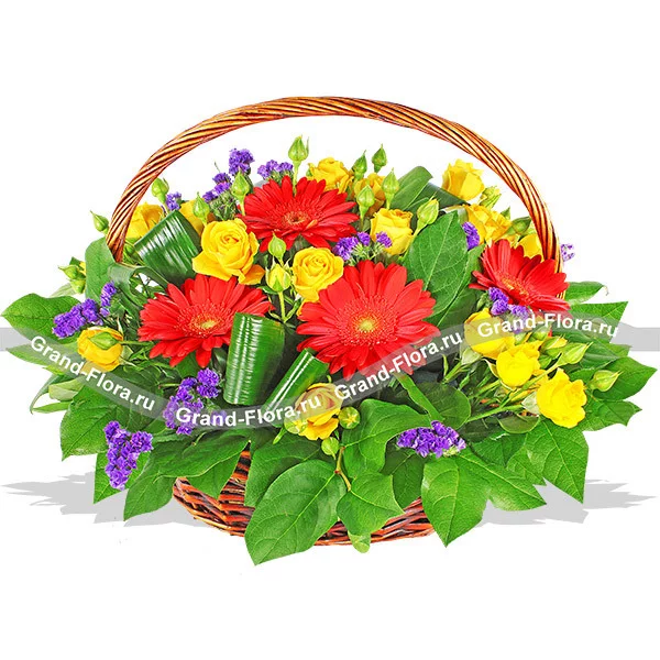 Стандартный (на фото): гербера оранжевая - 4 шт., роза желтая кустовая - 5 шт., статица - 7 шт., декоративная зелень, оазис, корзина малая.