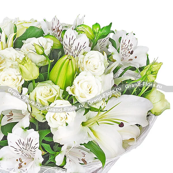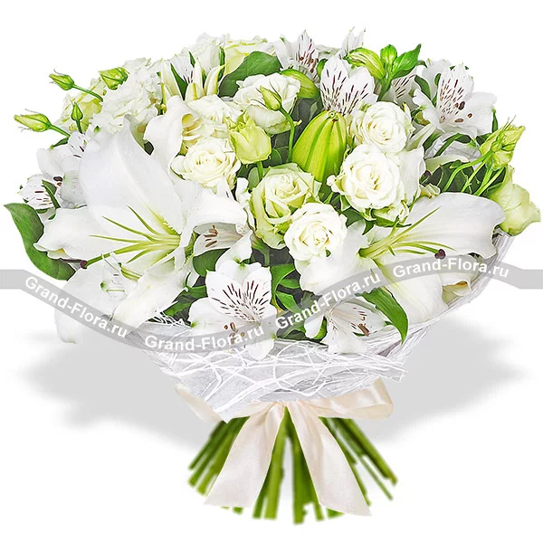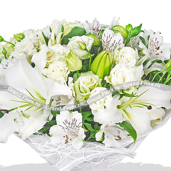 Воплощенная нежность и изящность букета, не может остаться незамеченной. Словно белое платье невесты, букет завораживает нежностью и невинностью. Наполненный альстромериями, лилиями, эустомами и розами кристально – белых оттенков, он дарит ощущение невесомости и свободы, которое остается в глубине самого сердца.
