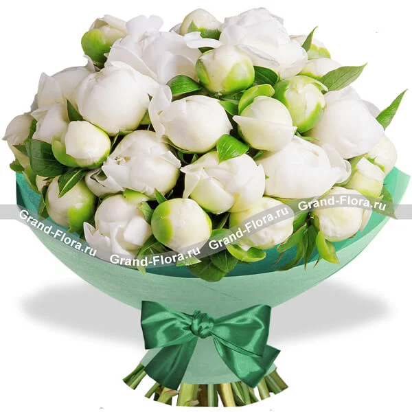 ДЕЛЮКС: пионы белые - 7 шт., фетр зеленый, бант зеленый.