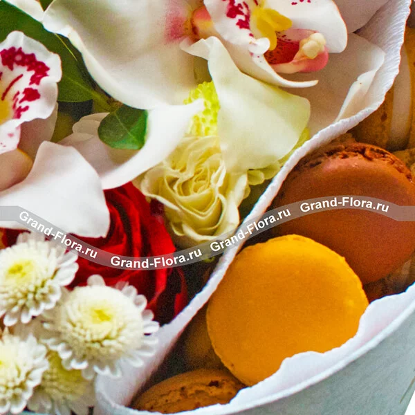 Стандартный (на фото): роза красная - 3 шт., роза кустовая кремовая - 1шт., хризантема белая мелкоцветная - 1 шт., орхидея белая - 3 шт., оазис, макарунс - 8 шт., фетр белый, коробка круглая (20х20см).