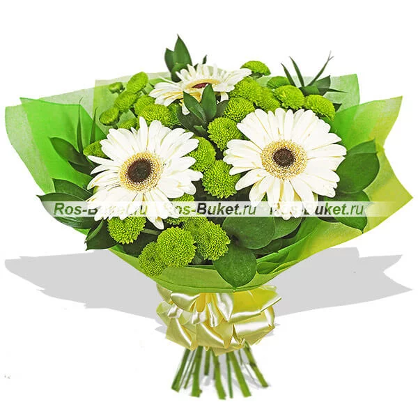 ЛЮКС: гербера белая - 5 шт, хризантема кустовая зеленая - 5 шт, рускус, фетр зеленый.