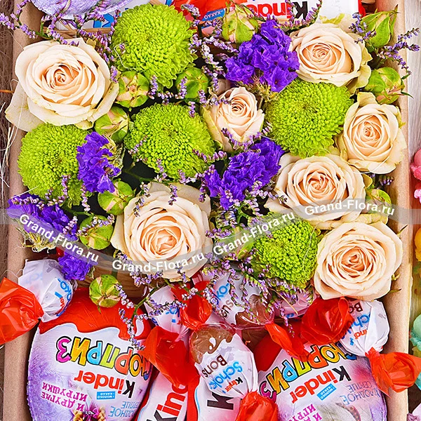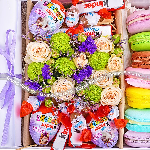 Оригинальное поздравление, в составе которого есть как цветы, так и сладости: роза кустовая белая  и хризантема кустовая зелёная, вместе, создают неповторимый и стильный дуэт на оазисе, который будет радовать дольше обычного букета, милые акценты статицы отлично дополняют всю композицию в целом. Сладкие макаруны и целая коллекция продукции киндер, несомненно не оставят равнодушным ни одного сладкоежку, а эффектной завершающей нотой станет послание в письме, текст которого Вы сможете составить сами! Обращаем Ваше внимание, что состав и оформление может отличаться.