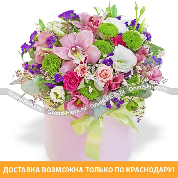 Стандартный: орхидея розовая - 2 шт., хризантема кустовая зеленая - 2 шт., статица синяя - 3 шт., лимониум - 2 шт., эвкалипт, лизиантус розовый - 2 шт., лизиантус белый - 1 шт., оазис, шляпная коробка, лента.