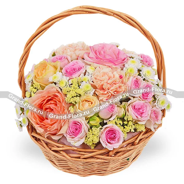 Стандартный: роза персиковая - 1 шт., роза розовая - 1 шт., гвоздика персиковая - 3 шт., роза кустовая розовая - 1 шт., роза кустовая кремовая - 2 шт., хризантема сантини - 3 шт., статица, оазис, корзина.