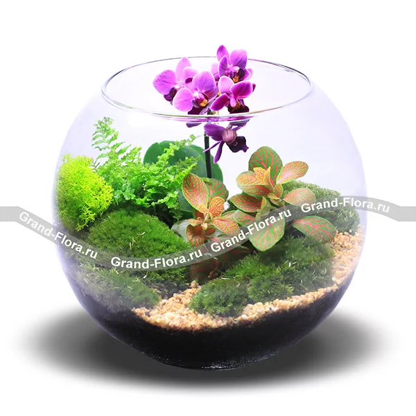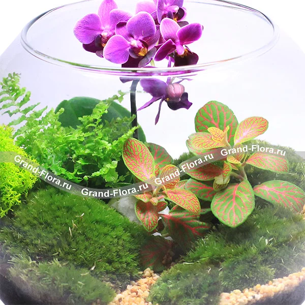 Стандартный: флорариум, мини орхидея (фаленопсис), фиттония, папоротник, мох.