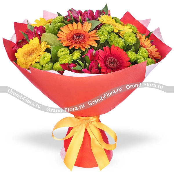 Стандартный: гербера микс - 3 шт., альстромерия красная - 2 шт., хризантема зеленая кустовая - 4 шт., декоративная зелень, упаковка, лента.