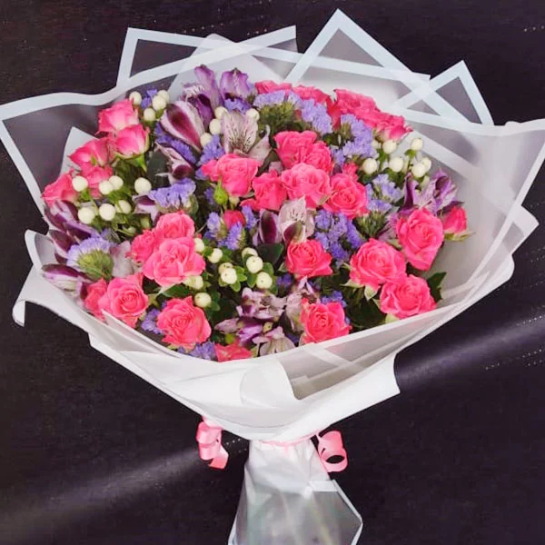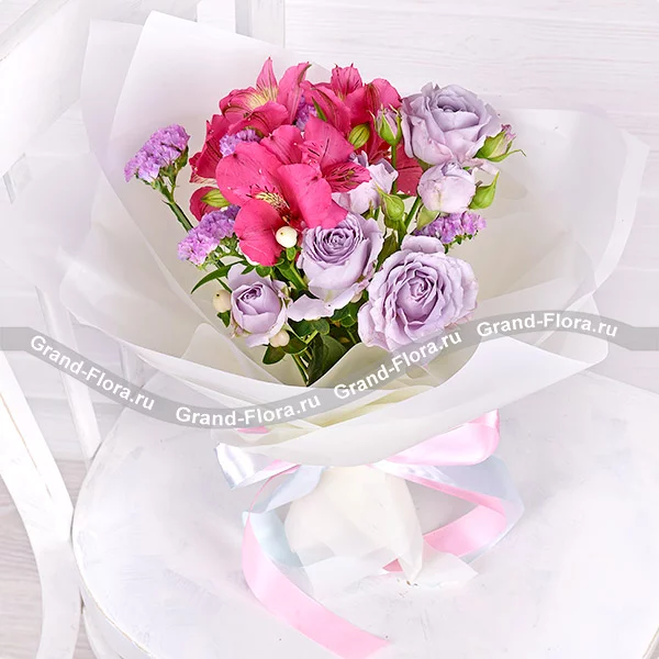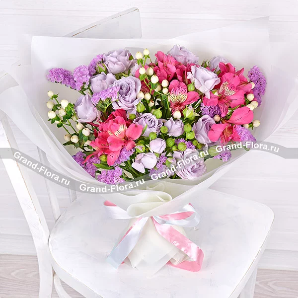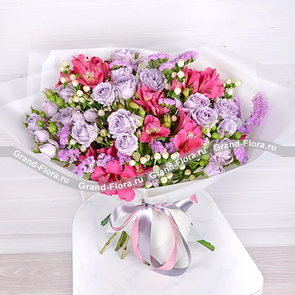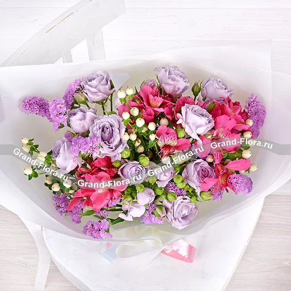 Кустовые розы светло-сиреневого оттенка гармонично сочетаются с розовой альстромерией и нежно-фиолетовой статицей. Подчеркивает воздушность и очарование цветочной композиции лунный гиперикум.